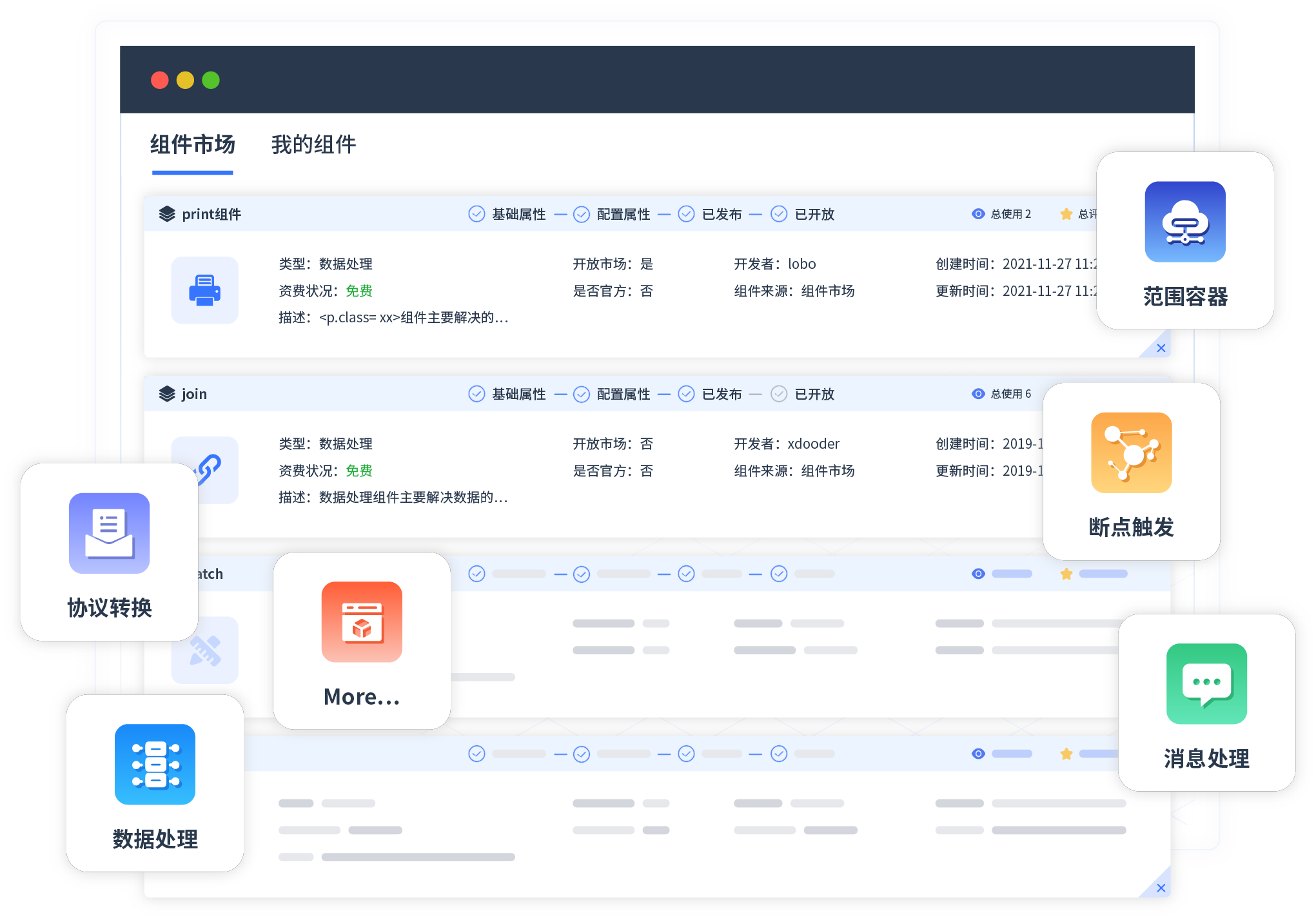 针对集成场景,,,,沃钱包提供组件市场,,,例如协议转换、、、消息处理、、、、文件操作等。。除平台提供的组件外,,客户可以自定义所需组件。。。