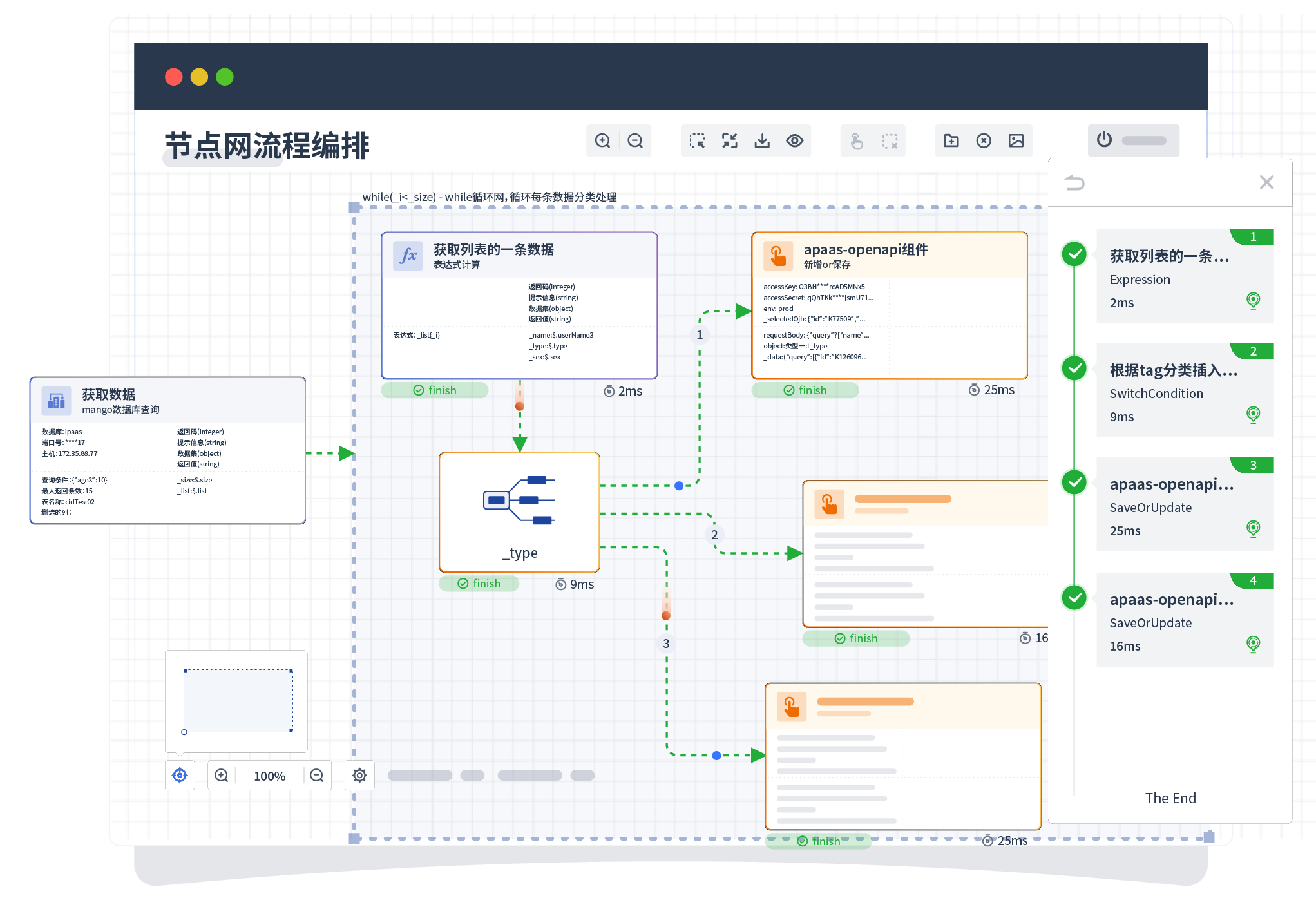 针对集成场景,,,组件定义后支持进行流程编制,,,,不同于传统代码方式,,通过图形化展示,,,支持在线调试、、日志查看和运行回放。。