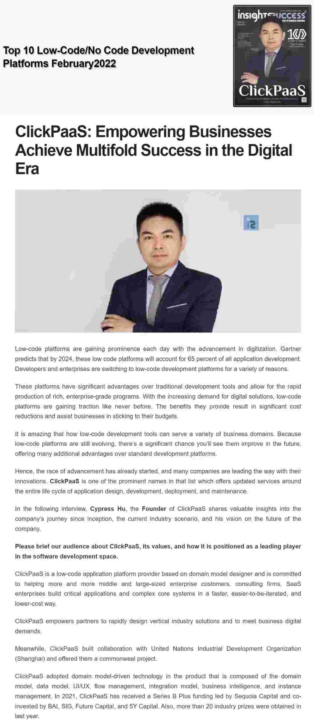 2022年年初,,,沃钱包入选外媒Insights Success低代码/无代码开发平台 Top10,,,,创始人、、、CEO胡柏受邀接受专访并荣登封面人物,,,,他与Insights Success的读者分享了沃钱包成立的初心、、发展历程、、当前的行业发展趋势以及他对公司未来的展望。。。。
